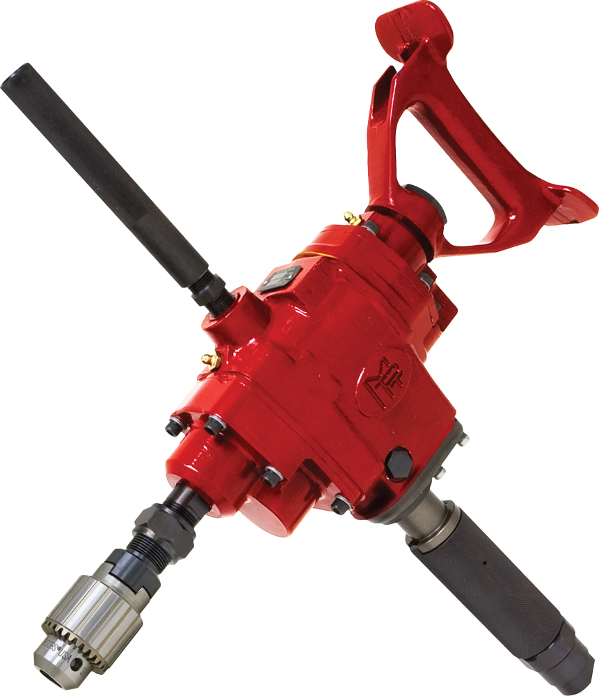 1/2" Extra Heavy-Duty Drill. Ideal for woodboring in marine timbers and railroad repair work. Features include ball bearing support for long life and efficient operation, a graduated roll throttle for speed control, and durable spur gearing. Includes breast plate, dead handle and a built-in lubricator.