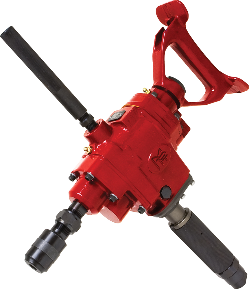 1/2" Extra Heavy-Duty Wood Boring Drill. Ideal for woodboring in marine timbers and railroad repair work. Features include ball bearing support for long life and efficient operation, a graduated roll throttle for speed control, and durable spur gearing. Includes breast plate, dead handle and a built-in lubricator.