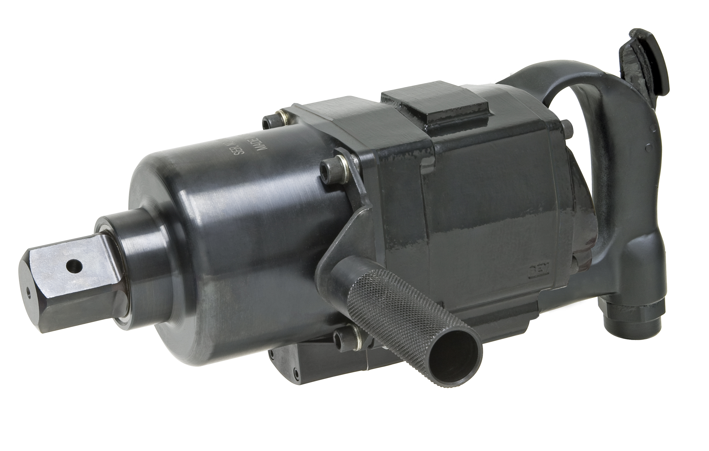 1-1/2" Square Drive Straight Outside Trigger Heavy-Duty Impact Wrench. Features a twin hammer clutch for more power per pound, a pressure fed clutch lubrication system, two piece motor housing for easy maintenance, a built-in muffler for low noise and direct drive for fast run down.