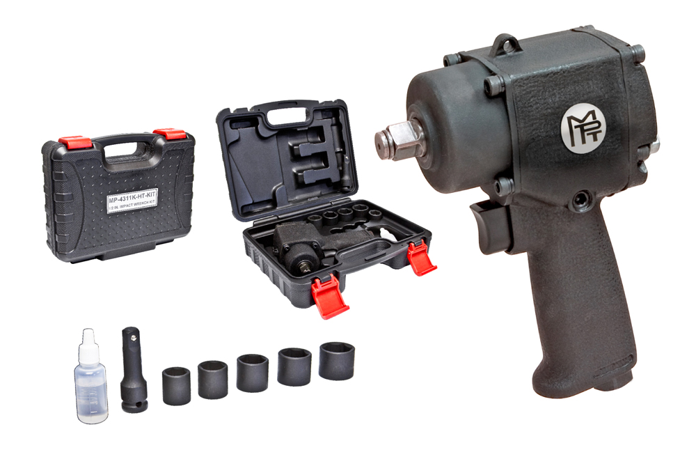1/2" Square Drive Stubby Pistol Impact Wrench Kit. Features a high torque output in a super compact design for access in confined or hard-to-reach areas. Aluminum housing and steel hammer case provide exceptional durability. Excellent weight and balance to reduce operator fatigue. A must for auto, diesel and aircraft mechanics. Kit includes case, five sockets (17, 19, 21, 22, and 24mm), 2" extension and air tool oil.