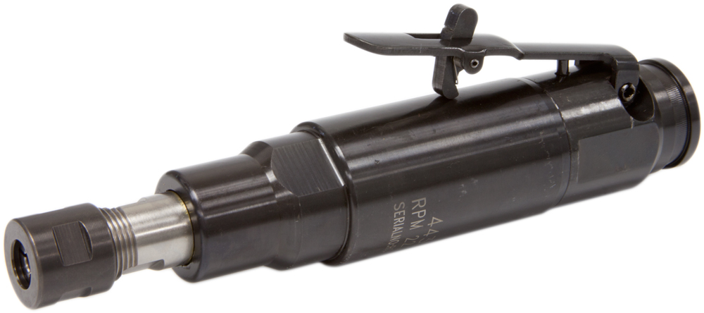 1/4" Collet Die Grinder - Rear Exhaust. Features a one-piece hardened and chrome plated spindle for durability and long tool life. The ergonomic three-bearing motor housing reduces vibration to the operator. Ideal for tool and die shops, tool rooms, foundries and anywhere fast metal removal is required.