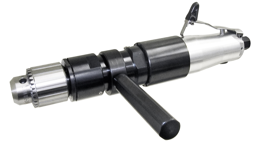 1/2" Non-Reversible Heavy-Duty Straight Drill. Rugged design aluminum handles. Compact, powerful drill uses precision machined planetary gears to generate high torque for drilling through heavy steel or titanium. Handle exhaust and muffler meet OSHA requirements. Includes dead handle.