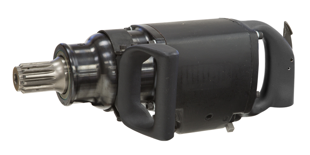 #5 Spline Drive Outside Trigger Heavy-Duty Straight Impact Wrench. Features a high energy per blow two jaw clutch, rugged steel clutch housing machined from bar stock, bronze alloy end plates for long motor life, a three piece housing allows for easy maintenance. Ideal for steel erection and bolting applications.