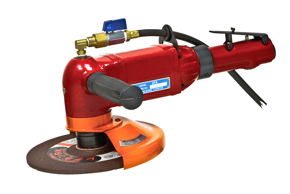 7" Capacity Type 27 Water Feed Angle Grinder. Features safety lever style throttle and side exhaust. Rugged, powerful, heavy-duty tool for steady production stone grinding. Maintains cutting speed under load. Removes material fast with less operator effort. Equipped with dead handle, guard and 6 ft hose with standard water faucet connector.