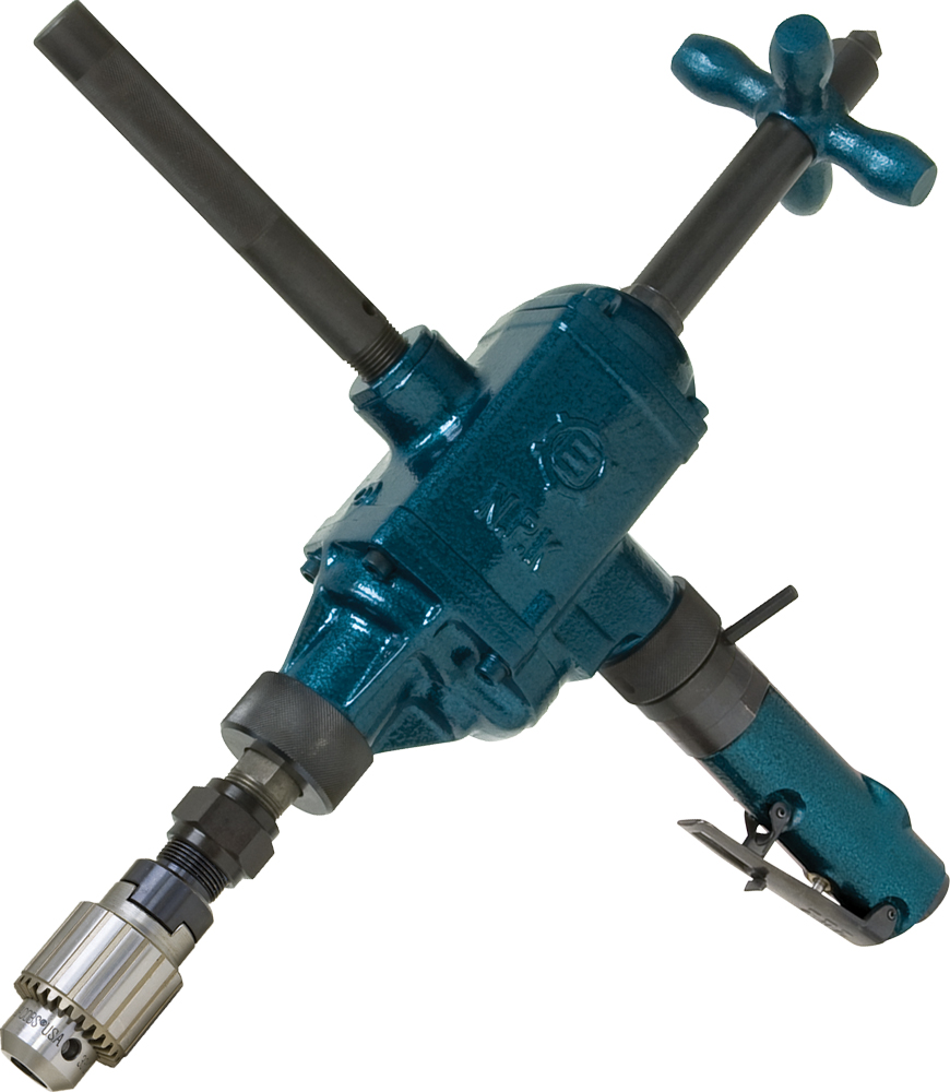 Heavy-Duty 9/16" Drilling Capacity 1/2" Chuck Reversible Drill. Equipped with safety lever throttle, feed screw and dead handle. Ideal for production work, boasting smooth operation for accurate drilling, reaming, tapping and wood boring. Possesses the lugging power to maintain speed when under load. Powerful and efficient for use in railroad shops, shipyards, tool rooms and all types of construction work. Features ball bearing support for long life. - 1/2" air inlet thread requiring avg air consumption of 39 cfm - Recommended hose size of 1/2" - Built-in lubricator - 2 hp motor - 2-3/8" feed length