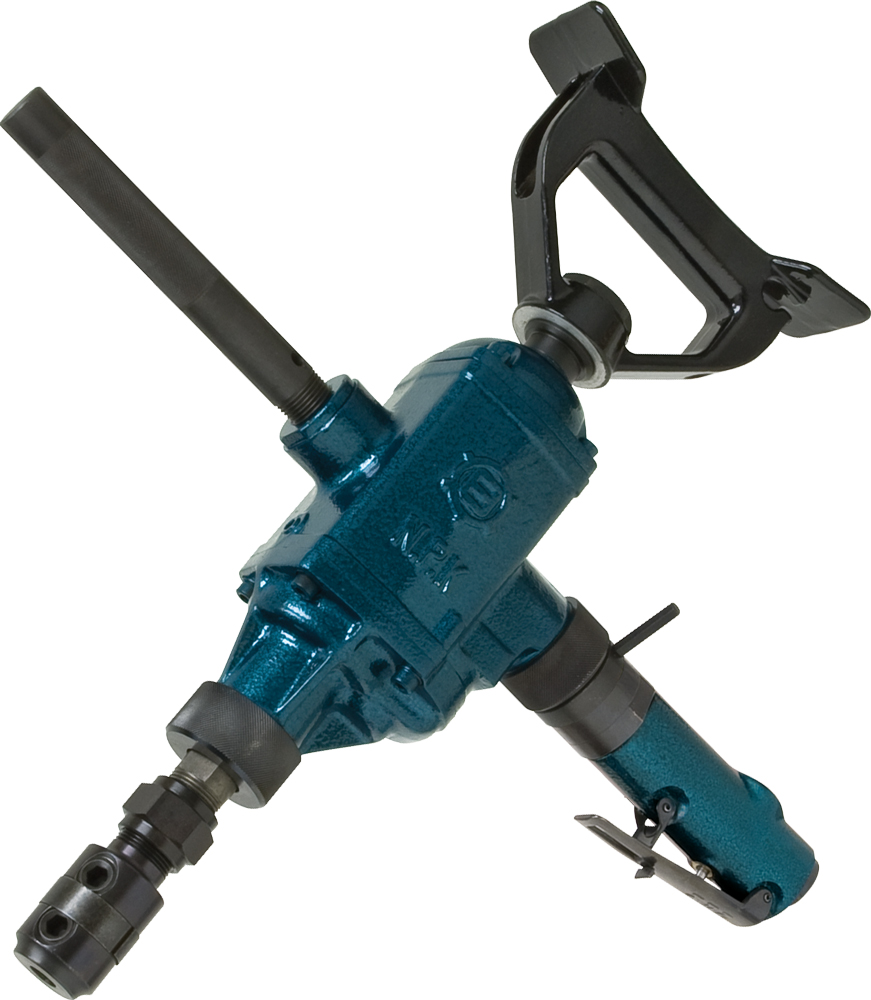 Heavy-Duty 9/16" Drilling Capacity Reversible Woodboring Drill. Equipped with safety lever throttle, breast plate and dead handle. Ideal for production work, boasting smooth operation for accurate drilling, reaming, tapping and wood boring. Possesses the lugging power to maintain speed when under load. Powerful and efficient for use in railroad shops, shipyards, tool rooms and all types of construction work. Features ball bearing support for long life. - 1/2" air inlet thread requiring avg air consumption of 39 cfm - Recommended hose size of 1/2" - Built-in lubricator - 2 hp motor - 2-3/8" feed length
