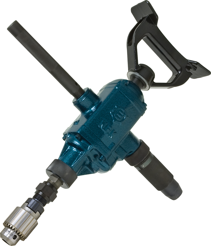 Heavy-Duty 5/8" Drilling Capacity 5/8" Chuck Reversible Drill. Equipped with self closing roll throttle, breast plate and dead handle. Ideal for production work, boasting smooth operation for accurate drilling, reaming, tapping and wood boring. Possesses the lugging power to maintain speed when under load. Powerful and efficient for use in railroad shops, shipyards, tool rooms and all types of construction work. Features ball bearing support for long life. - 1/2" air inlet thread requiring avg air consumption of 39 cfm - Recommended hose size of 1/2" - Built-in lubricator - 2 hp motor - 2-3/8" feed length