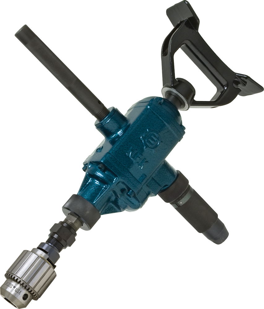 Heavy-Duty 3/4" Drilling Capacity 5/8" Chuck Reversible Drill. Equipped with self closing roll throttle, breast plate and dead handle. Ideal for production work, boasting smooth operation for accurate drilling, reaming, tapping and wood boring. Possesses the lugging power to maintain speed when under load. Powerful and efficient for use in railroad shops, shipyards, tool rooms and all types of construction work. Features ball bearing support for long life. - 1/2" air inlet thread requiring avg air consumption of 39 cfm - Recommended hose size of 1/2" - Built-in lubricator - 2 hp motor - 2-3/8" feed length