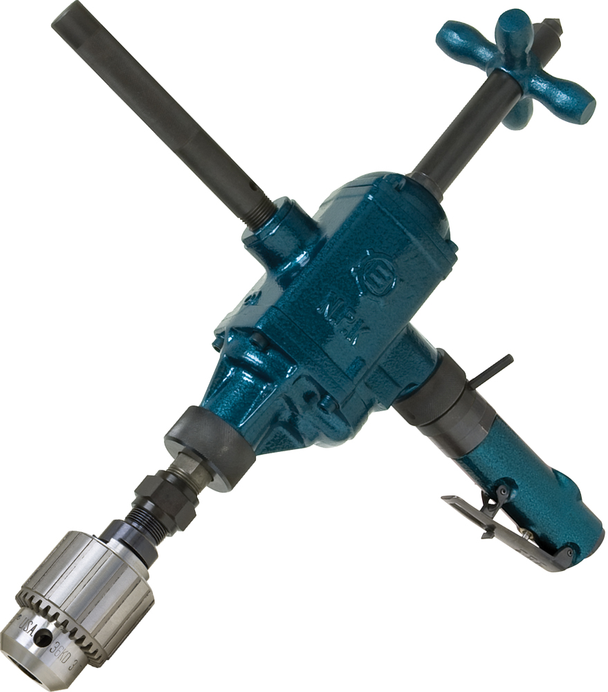 Heavy-Duty 3/4" Drilling Capacity 3/4" Chuck Reversible Drill. Equipped with safety lever throttle, feed screw and dead handle. Ideal for production work, boasting smooth operation for accurate drilling, reaming, tapping and wood boring. Possesses the lugging power to maintain speed when under load. Powerful and efficient for use in railroad shops, shipyards, tool rooms and all types of construction work. Features ball bearing support for long life. - 1/2" air inlet thread requiring avg air consumption of 39 cfm - Recommended hose size of 1/2" - Built-in lubricator - 2 hp motor - 2-3/8" feed length