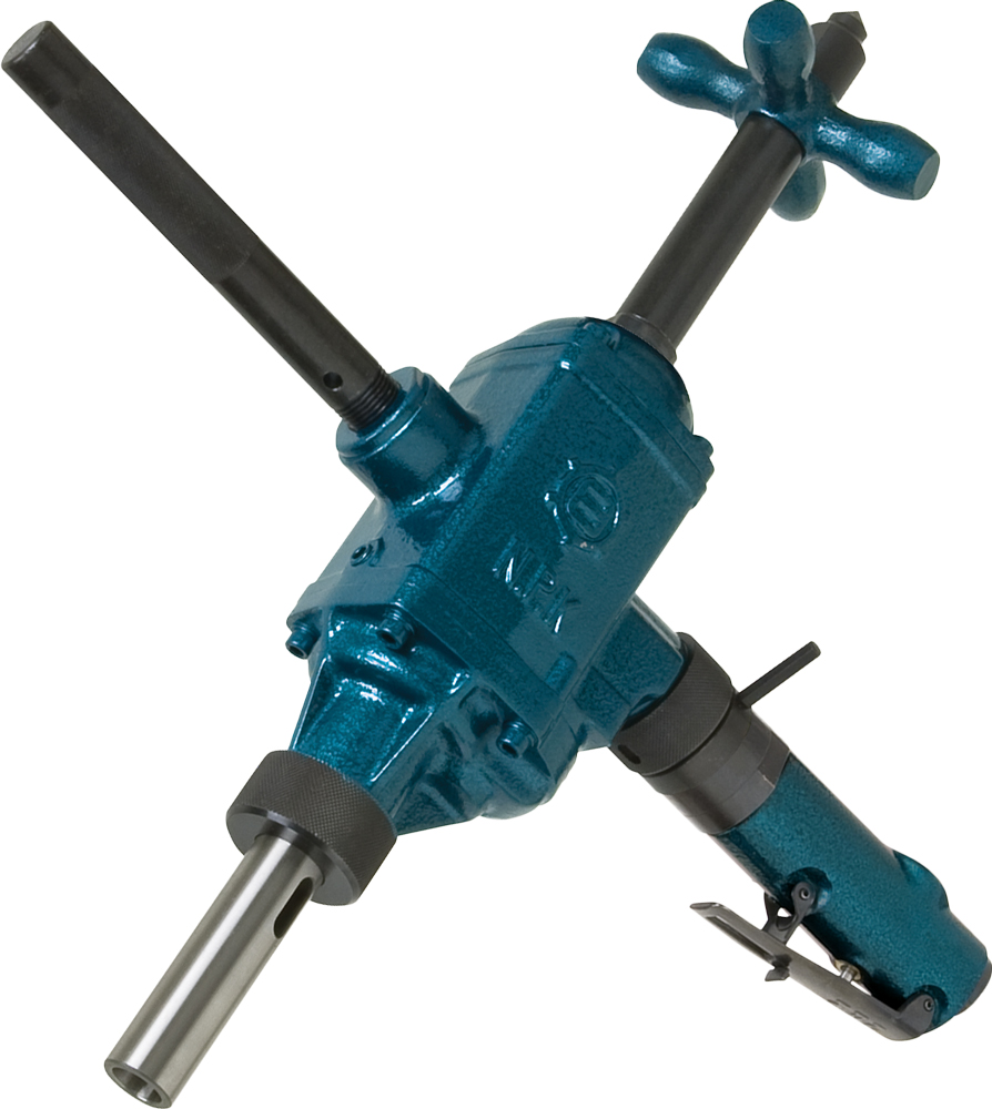 Heavy-Duty 3/4" Drilling Capacity 2MT Reversible Drill. Equipped with safety lever throttle, feed screw and dead handle. Ideal for production work, boasting smooth operation for accurate drilling, reaming, tapping and wood boring. Possesses the lugging power to maintain speed when under load. Powerful and efficient for use in railroad shops, shipyards, tool rooms and all types of construction work. Features ball bearing support for long life. - 1/2" air inlet thread requiring avg air consumption of 39 cfm - Recommended hose size of 1/2" - Built-in lubricator - 2 hp motor - 2-3/8" feed length
