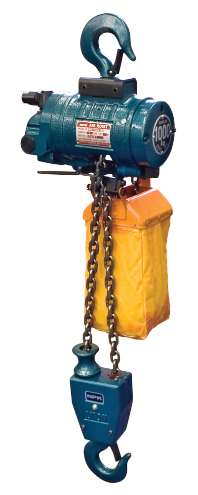 2200 Lb Capacity Link Chain Air Hoist. Efficient, High Speed Material Handling NPK air hoists are engineered to provide high lifting speeds and accurate control. Lightweight, compact design for use in a stationary position, but can also be quickly moved to another location. Air hoists are extremely useful in hazardous environments where electrical hoists are prohibited. Extra rugged construction for constant heavy-duty use. Overload proof air motor that can withstand constant stopping and starting. External screw adjusted speed control allows operator to any speed from the slowest creep to full throttle. Features external brake adjustment, exhaust muffler, built-in lubricator and swivel mounted air inlet. Equipped with 25 ft of lift, upper and lower safety latch hooks, limit stops and a pullcord rope style control.