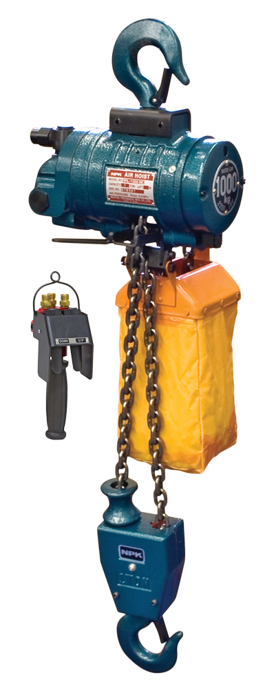 2200 Lb Capacity Link Chain Air Hoist. Efficient, High Speed Material Handling NPK air hoists are engineered to provide high lifting speeds and accurate control. Lightweight, compact design for use in a stationary position, but can also be quickly moved to another location. Air hoists are extremely useful in hazardous environments where electrical hoists are prohibited. Extra rugged construction for constant heavy-duty use. Overload proof air motor that can withstand constant stopping and starting. External screw adjusted speed control allows operator to any speed from the slowest creep to full throttle. Features external brake adjustment, exhaust muffler, built-in lubricator and swivel mounted air inlet. Equipped with 20 ft of lift, upper and lower safety latch hooks, limit stops and a pendant style control.