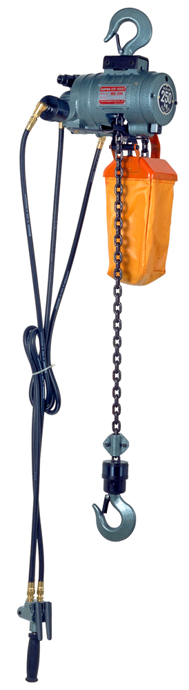 550 Lb Capacity Link Chain Air Hoist. Efficient, High Speed Material Handling NPK air hoists are engineered to provide high lifting speeds and accurate control. Lightweight, compact design for use in a stationary position, but can also be quickly moved to another location. Air hoists are extremely useful in hazardous environments where electrical hoists are prohibited. Extra rugged construction for constant heavy-duty use. Overload proof air motor that can withstand constant stopping and starting. External screw adjusted speed control allows operator to any speed from the slowest creep to full throttle. Features external brake adjustment, exhaust muffler, built-in lubricator and swivel mounted air inlet. Equipped with 25 ft of lift, upper and lower safety latch hooks, limit stops and a pendant style control.
