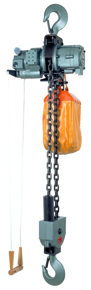 6160 LB Capacity Link Chain Air Hoist. Efficient, High Speed Material Handling NPK air hoists are engineered to provide high lifting speeds and accurate control. Lightweight, compact design for use in a stationary position, but can also be quickly moved to another location. Air hoists are extremely useful in hazardous environments where electrical hoists are prohibited. Extra rugged construction for constant heavy-duty use. Overload proof air motor that can withstand constant stopping and starting. External screw adjusted speed control allows operator to any speed from the slowest creep to full throttle. Features external brake adjustment, exhaust muffler, built-in lubricator and swivel mounted air inlet. Equipped with 8 ft of lift, upper and lower safety latch hooks, limit stops and a pullcord rope style control.